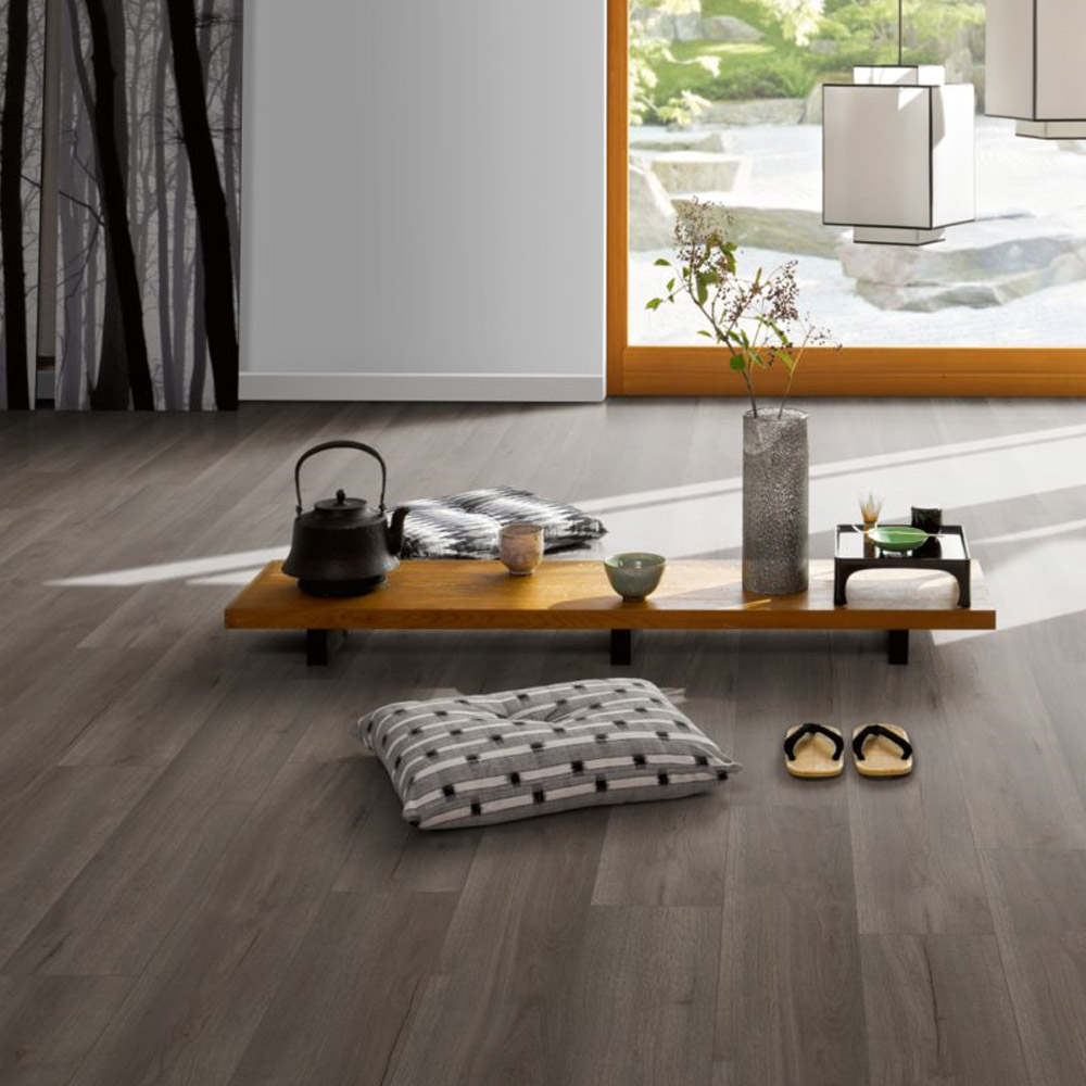 El modelo Roble Loft Fumé al Aceite Blanco AC5 se presenta en formato de una lama. El tono oscuro en este laminado lo hace más idóneo para su instalación en espacios amplios, donde aporta elegancia y exclusividad. La estructura de madera intensa se ve reflejada en las vetas y nudos de la madera de roble, intensos y marcados, para crear una mayor sensación de autenticidad. La presencia de bisel a los cuatro lados refuerza esta sensación de suelo de madera natural.