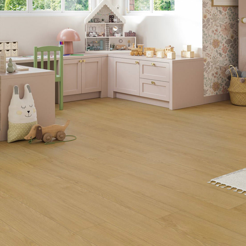 El modelo Roble Mont Blanc Natur AC5 se presenta en formato de una lama. La tonalidad de claridad media de este pavimento, en color beige, combina a la perfección en ambientes clásicos y tradicionales. La textura de madera mate, con una óptica suave y muy cuidada, resalta el realismo en este pavimento, que imita con gran autenticidad los suelos de madera natural. El modelo dispone de bisel a los cuatro lados, que refuerza el realismo y originalidad de este suelo.