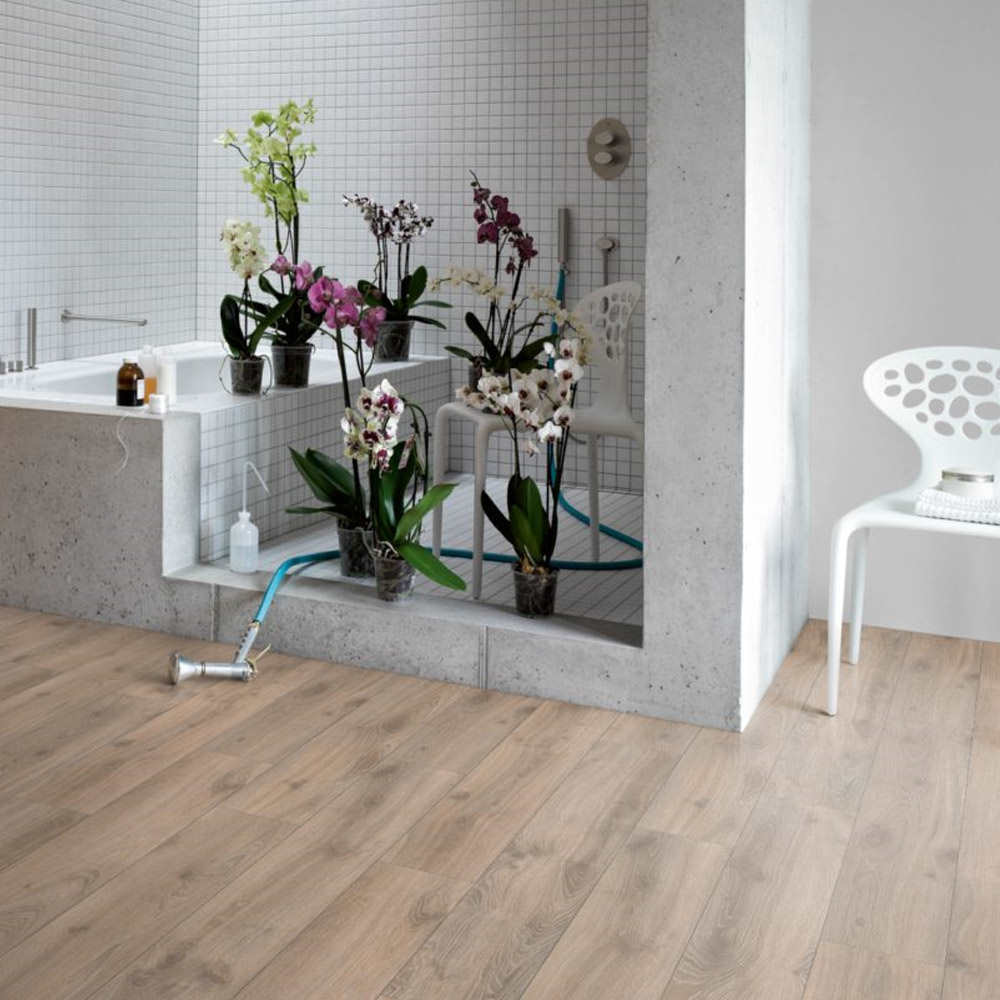 Gracias a su avanzada tecnología hidrófuga, estos suelos son aptos para su instalación en estancias húmedas, como cocinas y baños, brindando una protección de hasta 48 horas contra el agua estancada. Para un sellado óptimo de la pieza, los modelos incluyen también una protección perimetral contra el hinchamiento de los cantos.