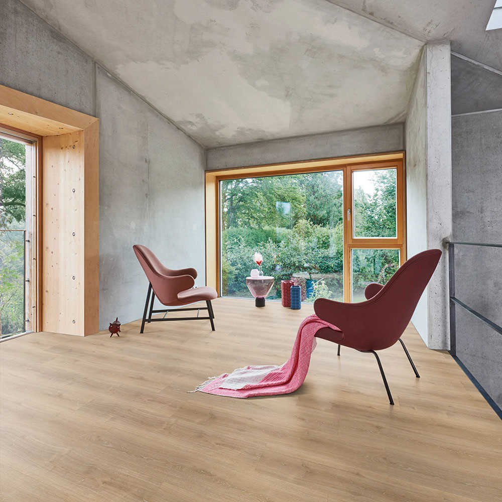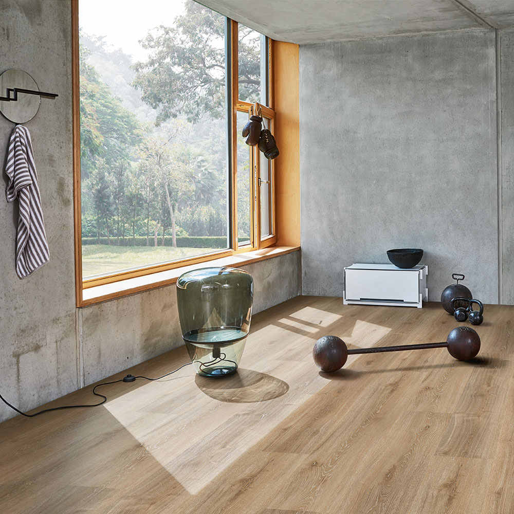 El modelo Roble Royal Claro Calizo se presenta en formato de 1 lama, con un grosor total de 9,4 mm y una capa de uso de 0,3 mm. Este suelo de vinilo tiene una óptica extremadamente realista gracias a la estructura de madera de la superficie, que recrea con gran realismo y autenticidad las vetas y nudos de la madera natural. Su tonalidad media aporta mucha calidez al espacio. Este suelo de vinilo, que se presenta sin bisel, encaja muy bien en cualquier tipo de ambientes, desde los más clásicos y tradicionales, hasta los más modernos y vanguardistas.