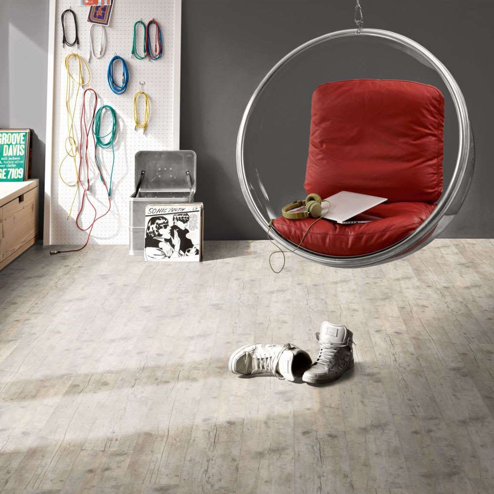 El modelo Madera Antigua Blanqueada se presenta en formato de 1 lama, con un grosor total de 6 mm y una capa de uso de 0,55 mm. Este suelo tiene un diseño muy moderno y original, donde destaca la estructura antigua de la madera gastada y con detalles de procesamiento que crean una óptica muy singular y un efecto visual que encaja a la perfección en ambientes industriales. La presencia de bisel a los cuatro lados realza cada listón creando un acabado muy auténtico y un estilo muy personal.