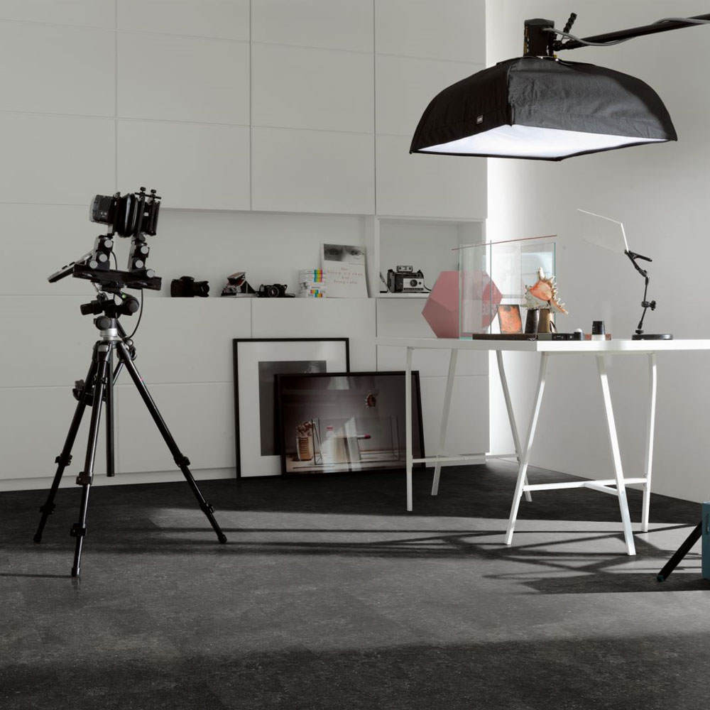El modelo Granito Antracita se presenta en formato de baldosa grande, con un grosor total de 8 mm. El modelo presenta un tono muy oscuro que encaja mejor en estancias amplias. Su diseño en estructura auténtica, que resalta con gran realismo las irregularidades del granito, aporta una gran elegancia al espacio, creando ambientes auténticos y originales. Dispone de bisel a los cuatro lados, que refuerza el aspecto de suelo de granito original.