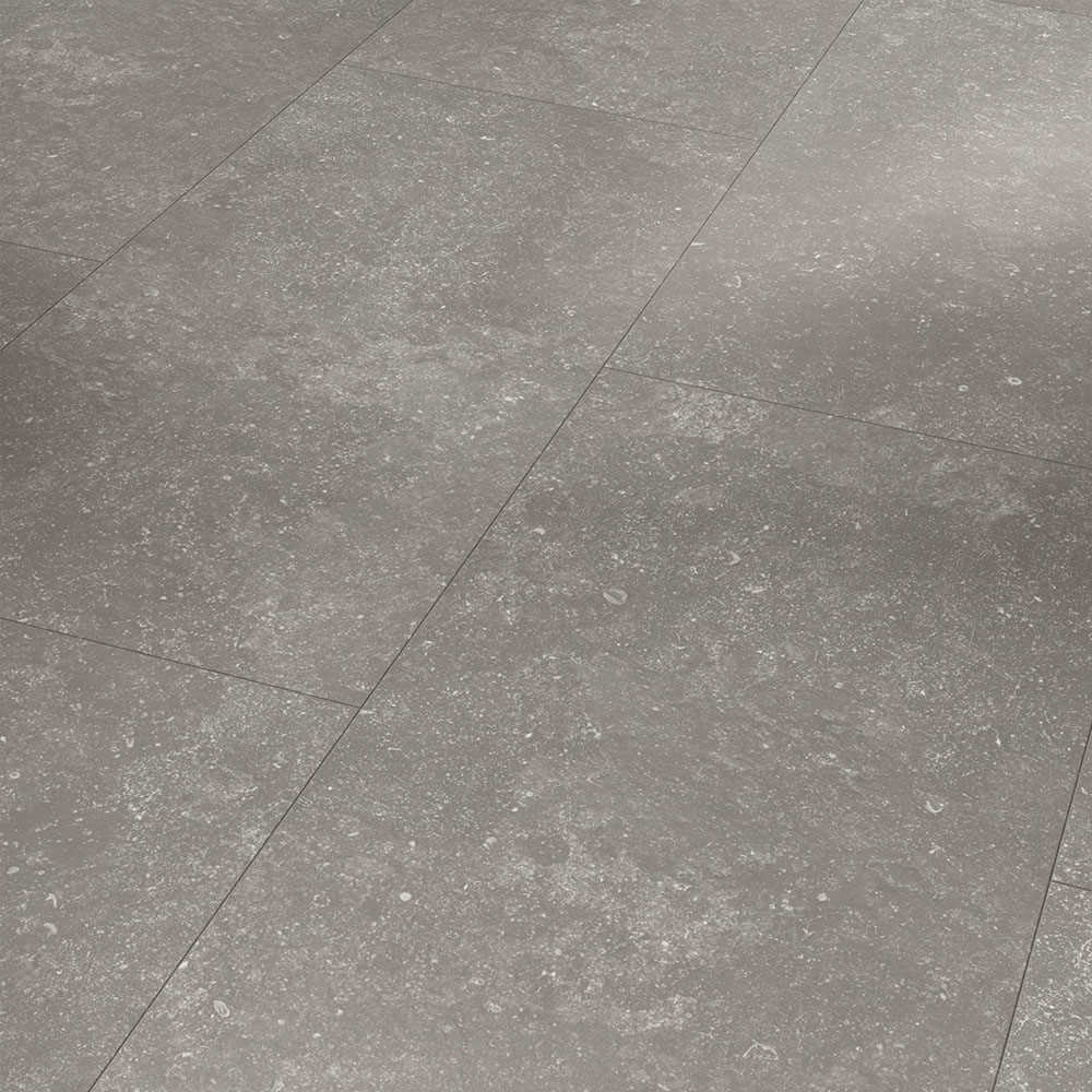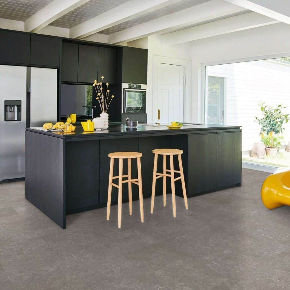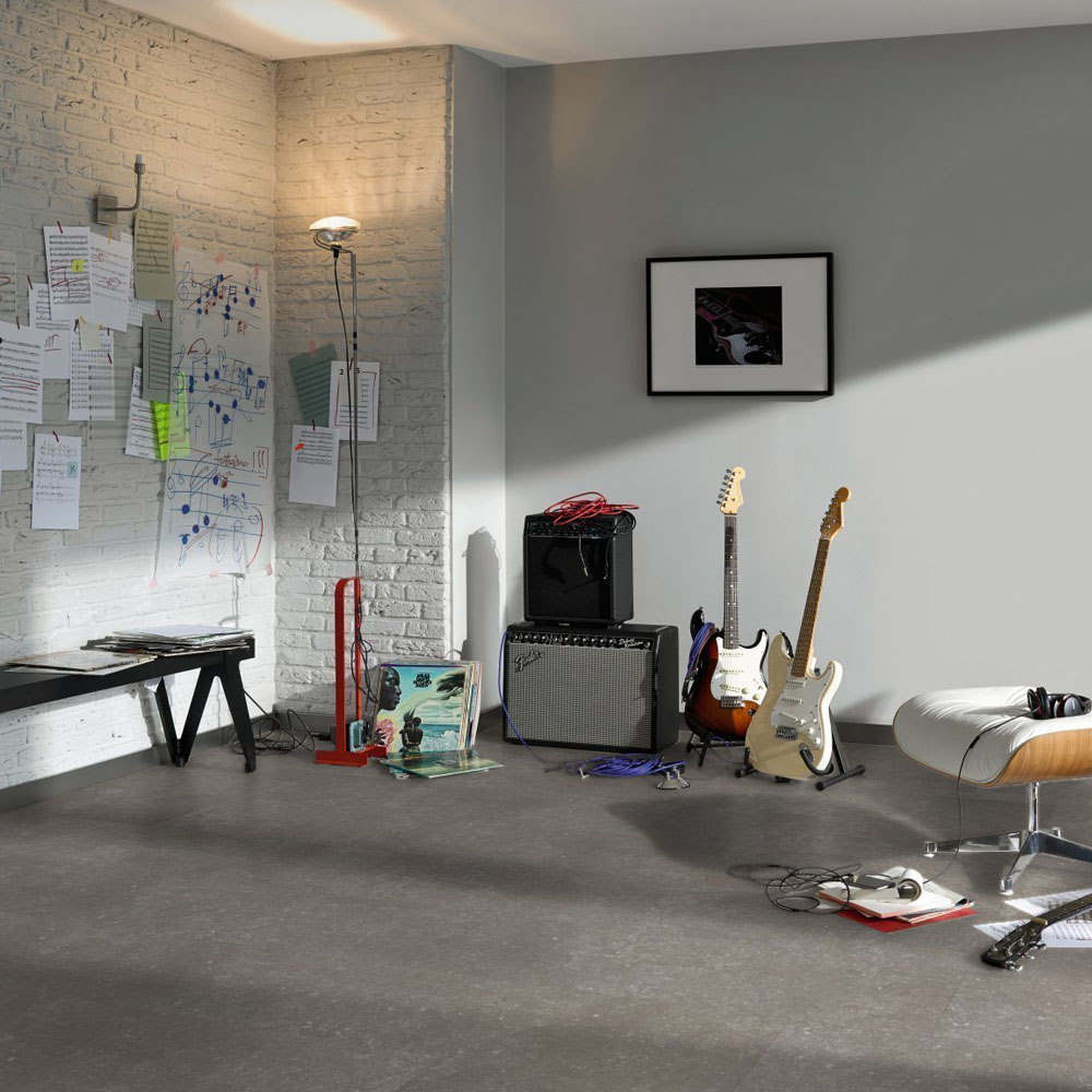 El modelo Granito Gris se presenta en formato de baldosa grande, con un grosor total de 8 mm. La presencia de bisel perimetral y la estructura auténtica en este suelo, que recrea de forma muy realista el granito, con una óptica y textura que imita las pequeñas irregularidades de este material, aporta una gran autenticidad al espacio. Es un modelo que, por su tonalidad oscura, combina mejor en ambientes amplios.